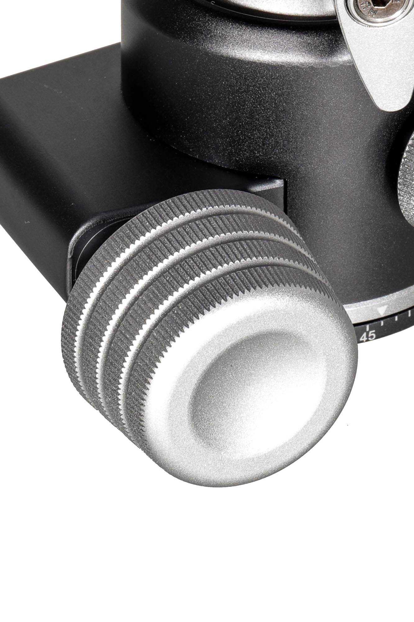 De lekker grote knop dient zowel voor het rotsvast vastzetten van de camera, als het instellen van de weerstand (friction control)