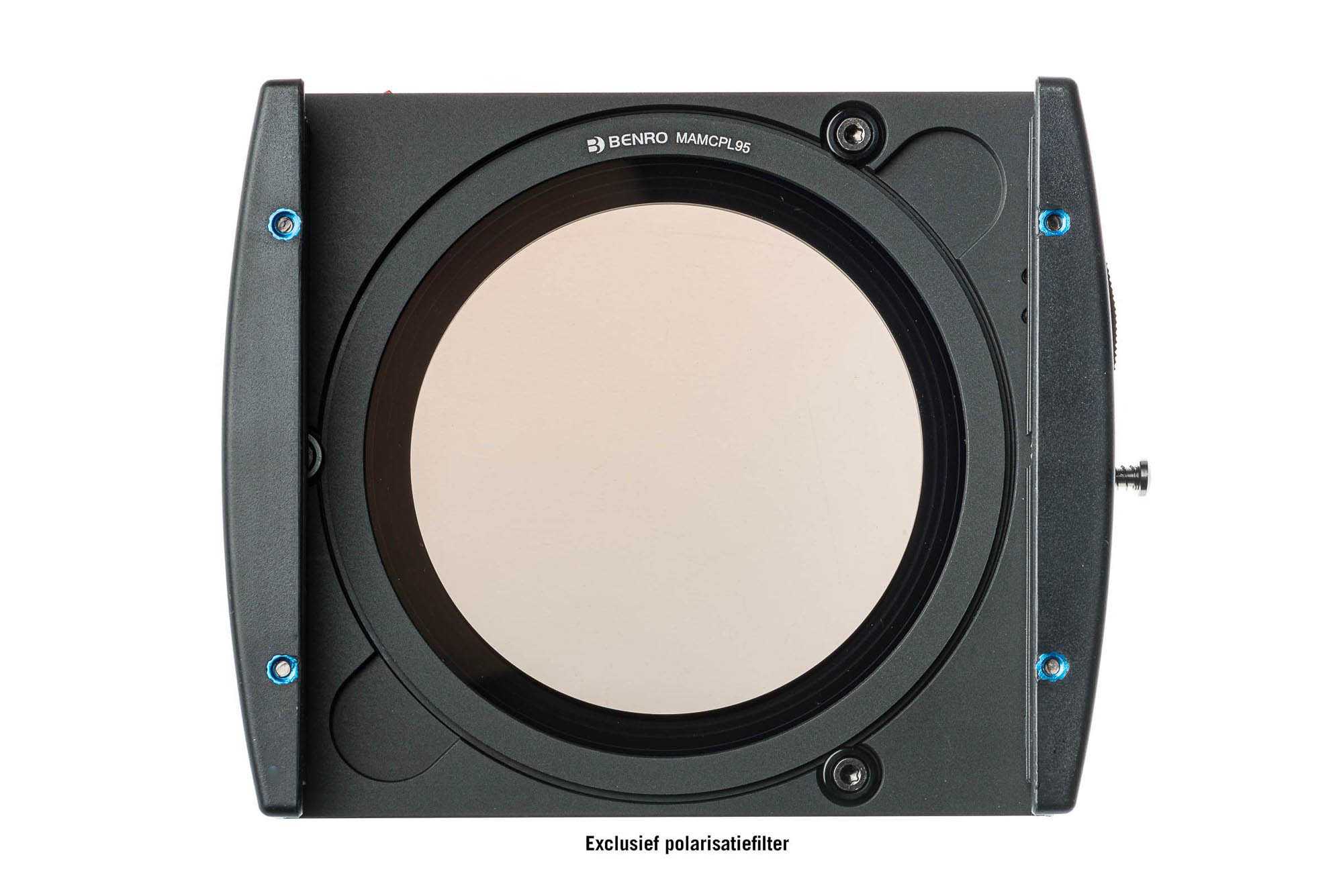Met deze filterhouder is het mogelijk om verloopfilters snel en nauwkeurig te positioneren met een draaiknop. In deze filterhouder is plaats voor 3 rechthoekige filters (100mm breed en 2mm dik) en een polarisatiefilter. Het polarisatiefilter is via de zijkant en via de achterzijde te bedienen terwijl er andere filters voor zijn geplaatst. We adviseren om de 82mm of 95mm magnetische polarisatiefilters van Benro te gebruiken (MAMCPL82 of MAMCPL95).