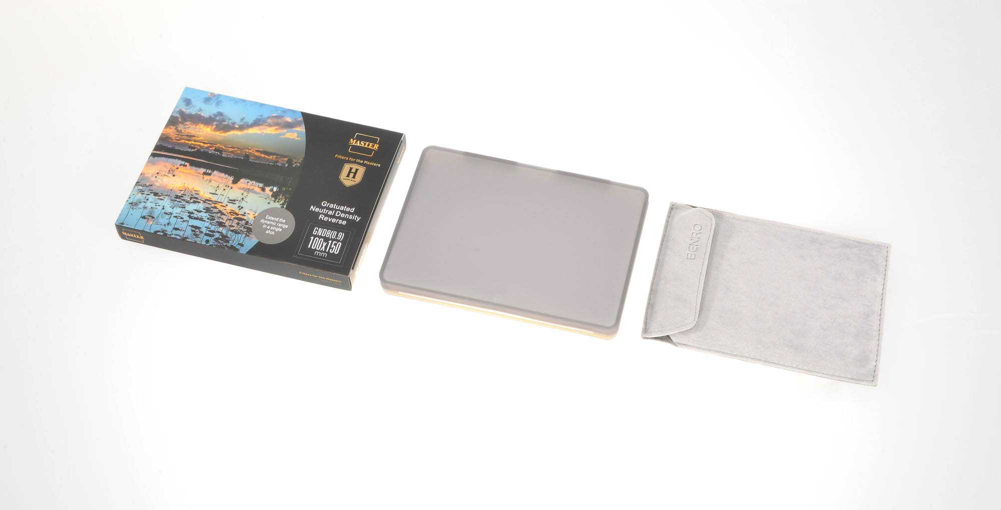 Alle glazen filters uit de Benro Master serie worden geleverd in een zachte beschermende pouch, welke op zijn beurt weer in een harde kunststof case is verpakt. Deze filters zijn verkrijgbaar in de sterktes 2, 3, 4 en 5 stops, en in de maten 75, 100, 150 en 170mm breed. Er zijn verschillende overgangen leverbaar: hard, zacht,medium hard, center en reversed.