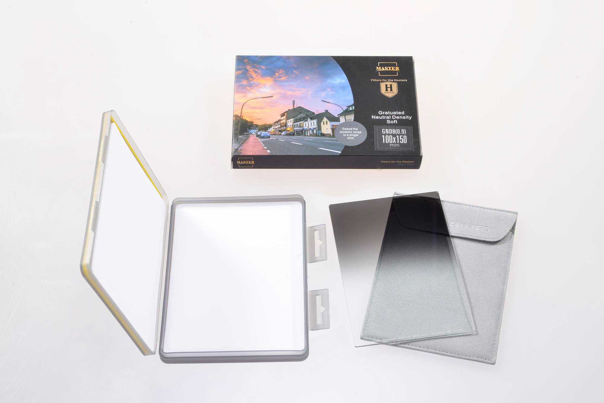 Alle glazen filters uit de Benro Master serie worden geleverd in een zachte beschermende pouch, welke op zijn beurt weer in een harde kunststof case is verpakt. Deze filters zijn verkrijgbaar in de sterktes 2, 3, 4 en 5 stops, en in de maten 75, 100, 150 en 170mm breed. Er zijn verschillende overgangen leverbaar: hard, zacht,medium hard, center en reversed.