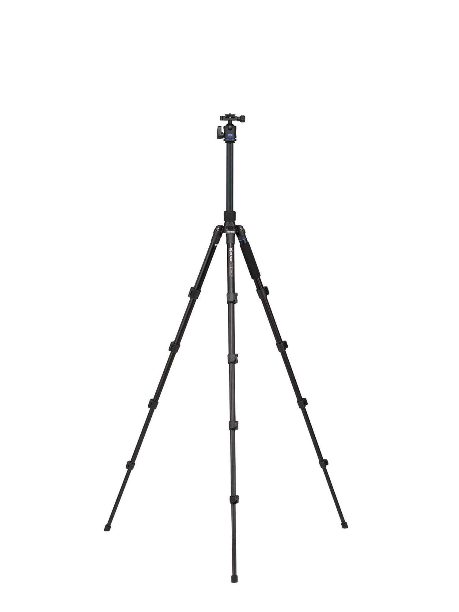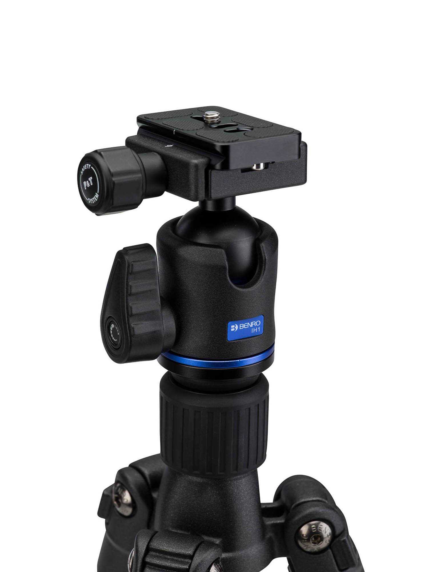 Het statief wordt compleet geleverd met een balhoofd met waterpas. Dit balhoofd heeft slechts een knop waarmee het balhoofd in een keer kan worden losgemaakt of vergrendeld. Het balhoofd wordt geleverd met een universele wisselplaat die onder de camera wordt bevestigd. De wisselplaat heeft een extra beveiliging die voorkomt dat deze plaat kan los schieten als hij niet is vastgeklemd. De wisselplaat is compatible met Arca-swiss. Hierdoor is deze aansluiting gemakkelijk uit te wisselen met andere producten van Benro of van andere merken. De wisselplaat is ook los leverbaar voor bijvoorbeeld een tweede camera.